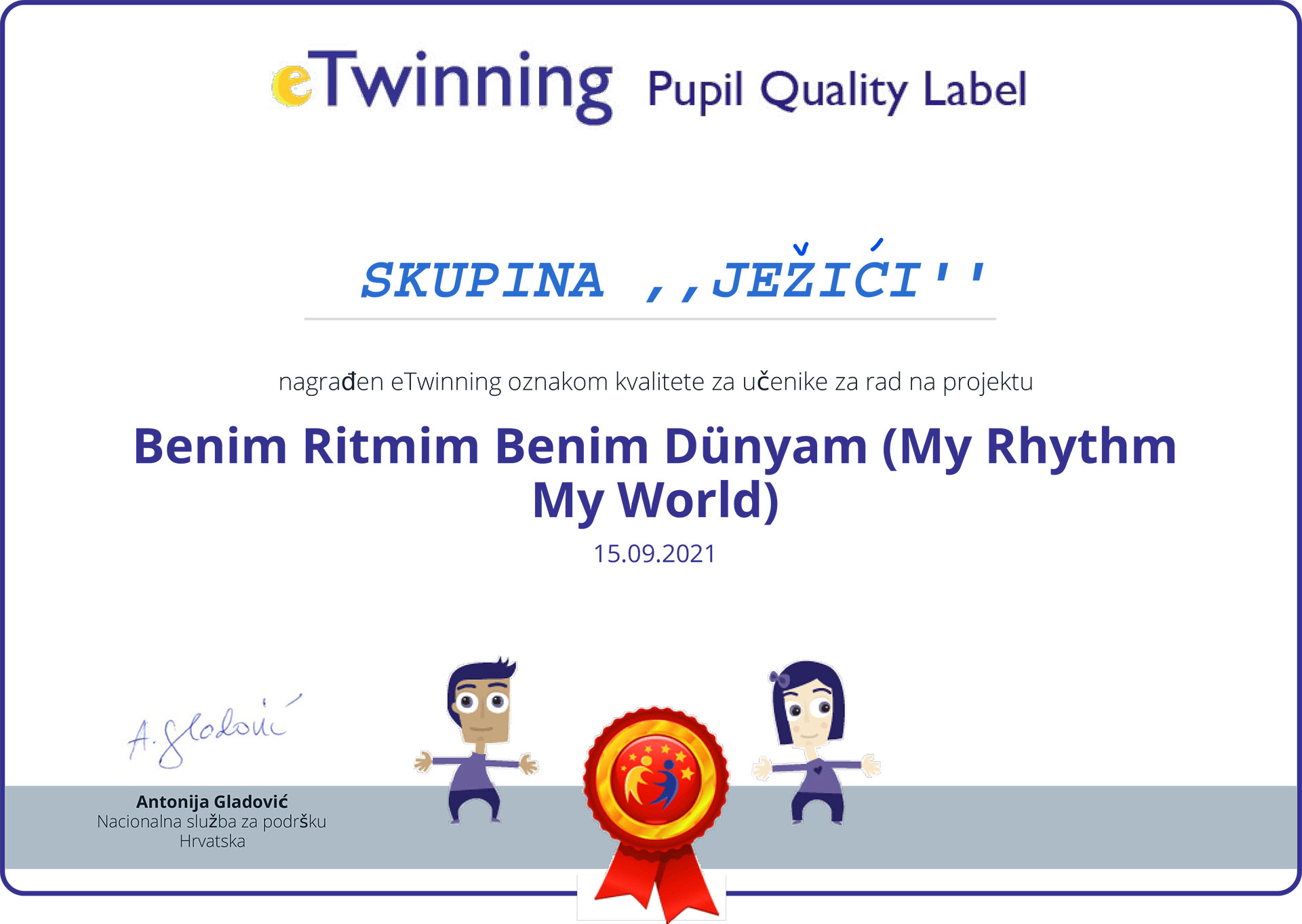 Dječjem vrtiću Bjelovar dodijeljena je oznaka kvalitete za eTwinning projekt ”Benim Ritmim, Benim Dünyam” (My Rhythm, My World). U projektu su sudjelovala djeca i odgojitelji iz Turske, Poljske, Malte i Hrvatske. Tijekom provedbe ovog eTwinning projekta korištene su pedagoške inovacije i različite metode u provođenju aktivnosti te su postavljeni jasni ciljevi za razvoj ključnih kompetencija. Suradnja i komunikacija među partnerskim vrtićima je ostvarena putem chata na Twinspaceu te putem videokonferencija. Tijekom provedbe korišteni su IKT alati koje su koristili odgojitelji i djeca sukladno svojoj dobi. Diseminacija je provedena na web stranici vrtića i partnera projekta, Twinspaceu te na dječjoj manifestaciji Cvjetno korzo. Provedena je evaluacija projekta.