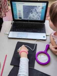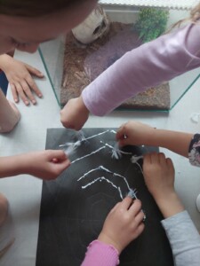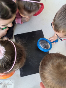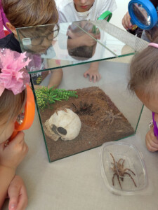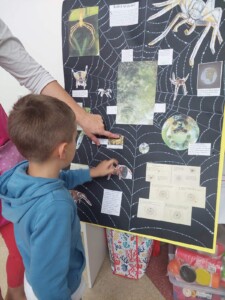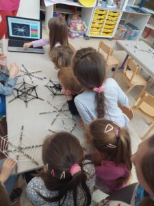 Radionica je započela igrom asocijacija, u kojoj su djeca rješavala zagonetna pitanja vezana uz pauke, a svaki točan odgovor otkrivao je dio slike pauka. Na ovaj zabavan način djeca su spontano ušla u svijet paučnjaka, skupine životinja kojoj pripadaju svi pauci. Uz razgovor i prezentaciju, djeca su upoznala raznolikost pauka – od malih, gotovo neprimjetnih vrsta do velikih i poznatih kao što su tarantula i crna udovica. Iako se razlikuju po veličini, boji i načinu života, svi pauci dijele jednu fascinantnu sposobnost – izgradnju mreže. Poseban fokus radionice bio je na paukove mreže: djeca su istraživačkim aktivnostima otkrivala kako nastaje mreža, od čega je napravljena, čemu služi i kako pauk uspijeva hodati po vlastitoj mreži bez da se na nju zalijepi. Saznali su da je paučina jedan od najčvršćih bioloških materijala poznatih čovjeku te da je paukova svila istovremeno lagana, elastična i iznimno snažna. Nakon uvodnih aktivnosti, djeca su krenula u potragu za pravim paukovim mrežama u dvorištu vrtića. Uz pomoć voditeljica radionice, paukove mreže su pronašli, pažljivo označili, a potom ulovili i pripremili za promatranje. Prava čarolija dogodila se kad su djeca mrežu promatrala pod optičkim i digitalnim mikroskopom – oduševljenje je bilo veliko kad su ugledali tanke, pravilne niti i strukture koje inače nisu vidljive golim okom. Nadalje, djeca su u terariju opažala i pregledavala prazne košuljice koje pauci ostavljaju nakon presvlačenja. Tako su stekli spoznaje o njihovom tijelu, broju nogu, očima i čulima te raznim oblicima prilagodbe. U kreativnom dijelu radionice, djeca su od grančica i vunenih niti izrađivala vlastite modele paukovih mreža, istražujući uzorke koje su naučila i razvijajući finu motoriku. Igra i učenje isprepleli su se i kroz aktivnosti koje su obuhvatile mimikriju, tj. sposobnost pauka da se prilagode okolini radi zaštite ili lova. Na kraju radionice održan je zabavni kviz znanja u kojem su djeca ponovila sve što su tijekom dana naučila – o vrstama pauka, njihovim mrežama, ulozi u prirodi i zanimljivostima iz njihovog života.